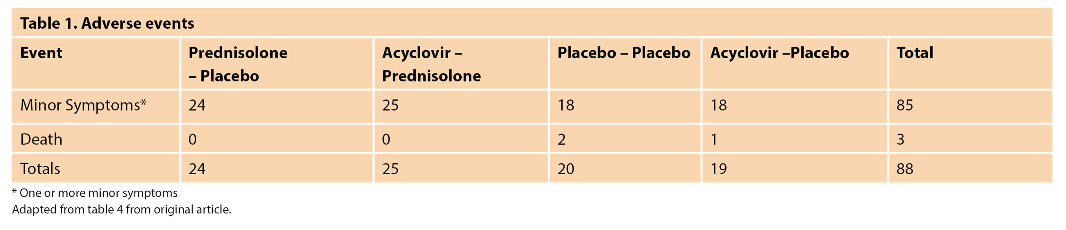 To sum up my appraisal of this paper, in the absence of an increase in complications by adding acyclovir, the short treatment period and low cost of the drug mean that I have low threshold to recommend giving both acyclovir and prednisolone, unless there are contraindications.