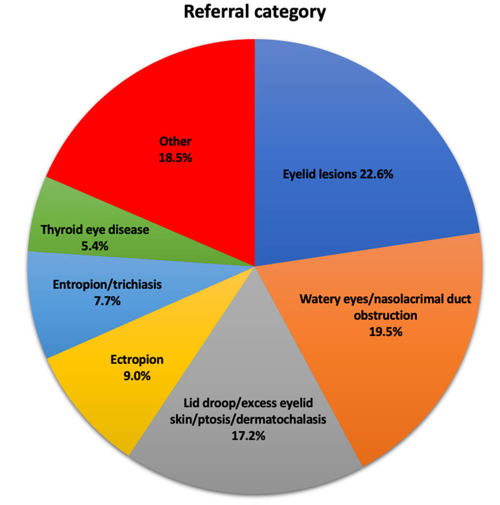 The Tennent Institute of Ophthalmology in Glasgow provides a tertiary referral service for oculoplastics to 1.2 million people in the West of Scotland. This service is provided by six oculoplastics consultants across five hospitals and includes adnexal, lacrimal and orbital surgery. We retrospectively reviewed referral and clinical records of all patients referred to this service from 1 January 2017 to 31 December 2017, in order to determine the categories of referrals and treatment outcomes at first visit to the service. Referrals vetted to the ‘Minor Operations Clinic’ were excluded from this study.