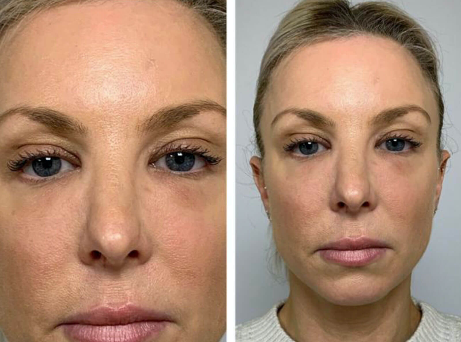 She was treated with hyaluronidase injection on three occasions over a period of eight weeks. 350IU of hyaluronidase was injected under each eye on each of the first two sessions, and 250IU was injected under each eye on the third session. Hyaluronidase was injected in the supraperiosteal, intramuscular and subcutaneous planes as well as directly into any areas of thickening, and the area was massaged. There was mild bruising and short-lived oedema following injections. The patient reported partial improvements after the first and second treatments, and complete resolution was noted four weeks after the third treatment. (Figure 4) and the patient reported satisfaction with the appearance of her face.