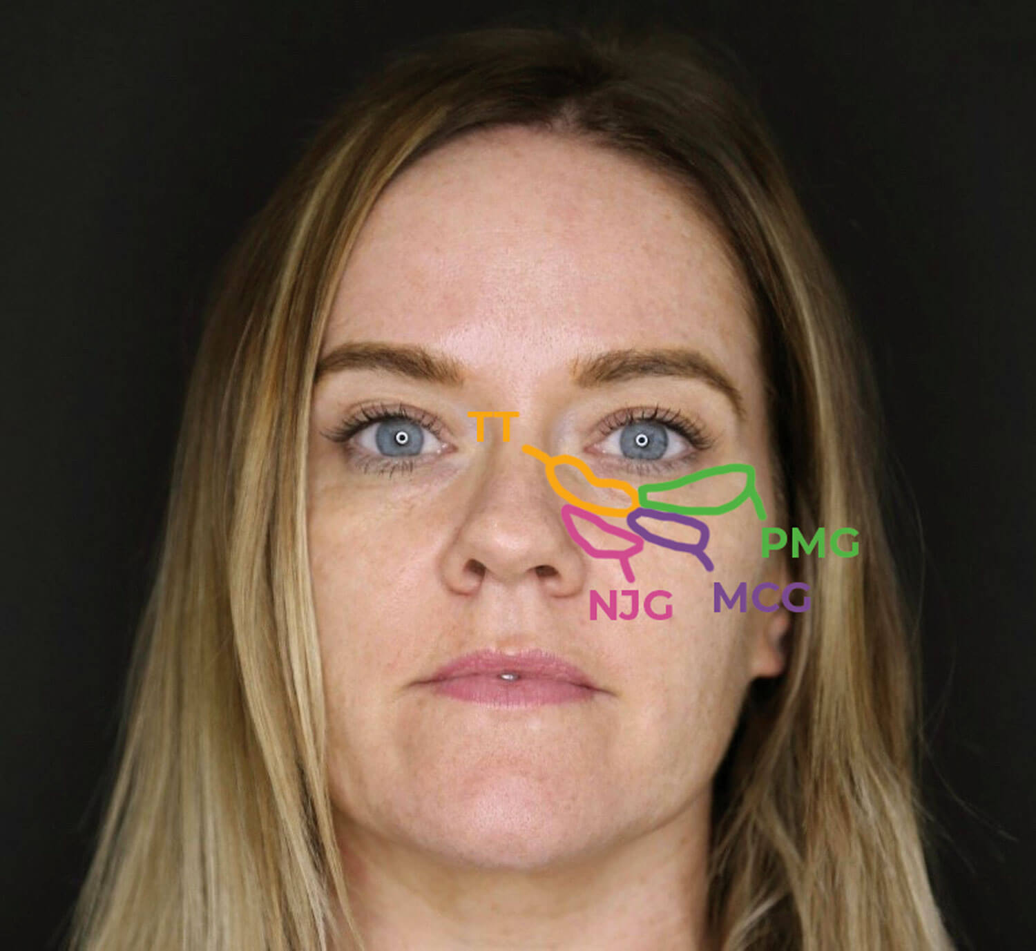 the tear trough (TT) groove, the palpebromalar groove (PMG) and the mid-cheek groove (MCG).