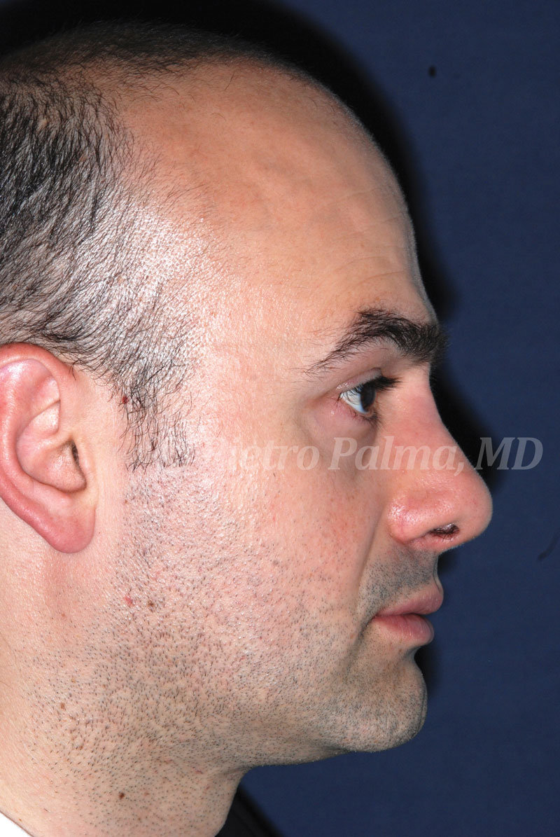 The bulging at the naso-frontal angle was excised (‘inclusion cyst’), the open roof was closed by intermediate and basal osteotomies, the low dorsum was corrected by placing an onlay graft taken from septal cartilage, the junction between inferior nasal spine and posterior septal angle was sculpted so to slightly change both projection and rotation of the nasal tip, and tongue-in-groove suture was used to stabilise tip position.