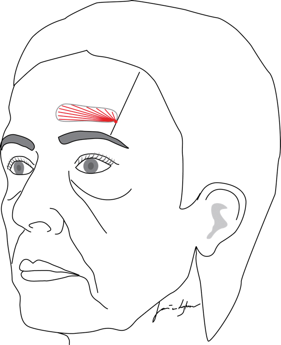 The frontal concavity is a depression that disrupts the youthful contour of the forehead and changes the light reflection. It runs approximately parallel to the supraorbital rim, just cranial to the brows and it is believed to be the result of predominantly bone resorption, but volume loss in the superficial fat and the frontalis muscle can also play a role. Commercially available soft tissue filler products can be used to correct this loss of volume and can be placed in different anatomical levels: