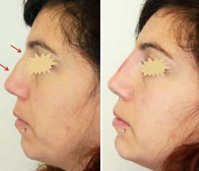 - Correction of the shape: the profile of the ‘saddle’ or ‘sunken’ nose, the straightening of the apparent nasal hump, the remodeling and lifting of the tip pointing downwards.
