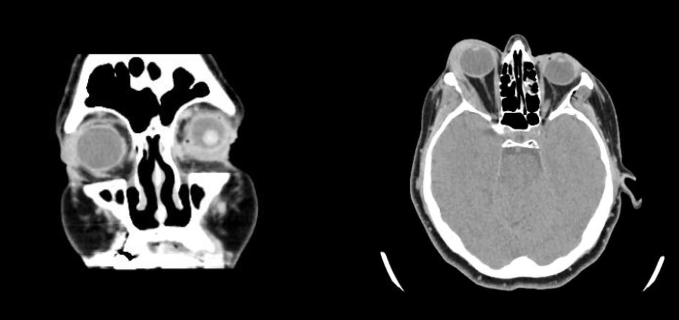 Figures 3 (left) and 4 (right): An 8mm soft tissue thickening at the lacrimal fossa of the right orbit involving the orbital and palpebral portions of the lacrimal gland. There is an additional linear thin soft density lining the lateral border of the right orbit adjacent to the right zygomatic bone, medially displacing the lateral rectus muscle.