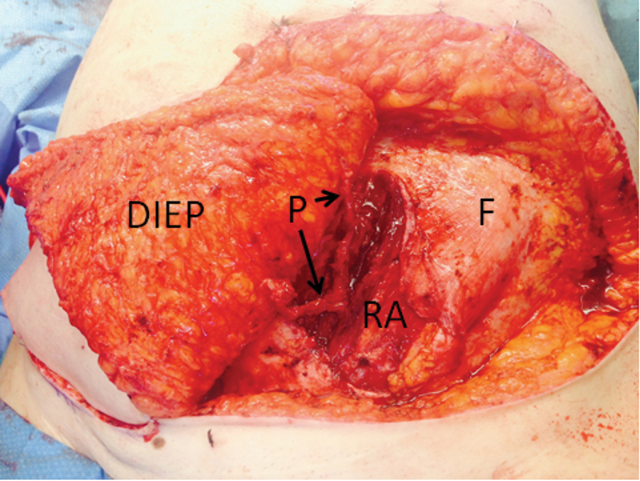 Figure 1: Intraoperative view of DIEP flap viewed from foot of the operating table. The flap has been reflected to the patients right side (to left of diagram) with two vascular perforators (P) shown as they are dissected through a vertical separation in the rectus abdominis (RA) muscle, seen under the deep fascia (F), which is opened for access to the vessels [5].