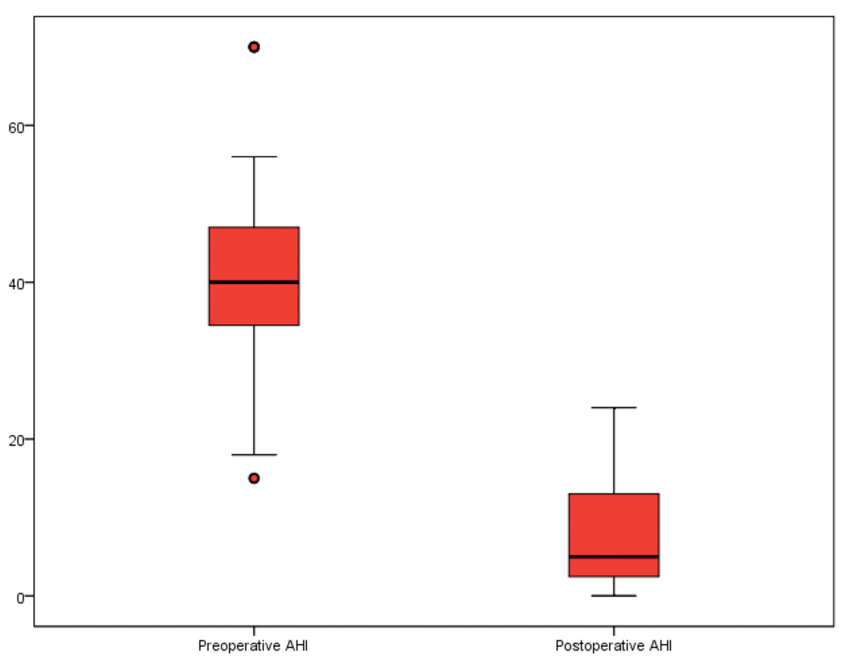 In our series 51 patients underwent MMA surgery for moderate to severe OSA. We compared preoperative and postoperative sleep study results in this group. The mean preoperative apnoea-hypopnea index (AHI) was 42 (SD 17) and this was reduced to mean postoperative AHI of 8 (SD 7) p<0.001. Similarly, the mean preoperative Epworth Sleepiness Score (ESS) was 14 (SD 4) and this decreased to mean postoperative ESS of 5 (SD 4), p<0.001. The mean oxygen nadir improved from 76% to 83%, p=0.006. The average age of the group was 44 years and the mean BMI was 28 (SD 3). All subjects in our series (100%) had an improvement in postoperative AHI and ESS scores when compared to baseline values. We noted that 85% of these individuals met the criteria for surgical ‘success’ (AHI <15 and 50% reduction in AHI), furthermore, 59% were found to have a postoperative AHI (<5) in keeping with surgical ‘cure’. A recent meta-analysis evaluating surgical outcomes following MMA using similar ‘success’ and ‘cure’ criteria as in our institution, reported a pooled surgical success rates of 86% and 43% respectively [9].
