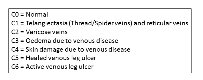 In the venous world we grade these different clinical entities by using a sort of short-hand. We use the clinical part of the Clinical Etiological Anatomical and Pathological (CEAP) score (Figure 2).