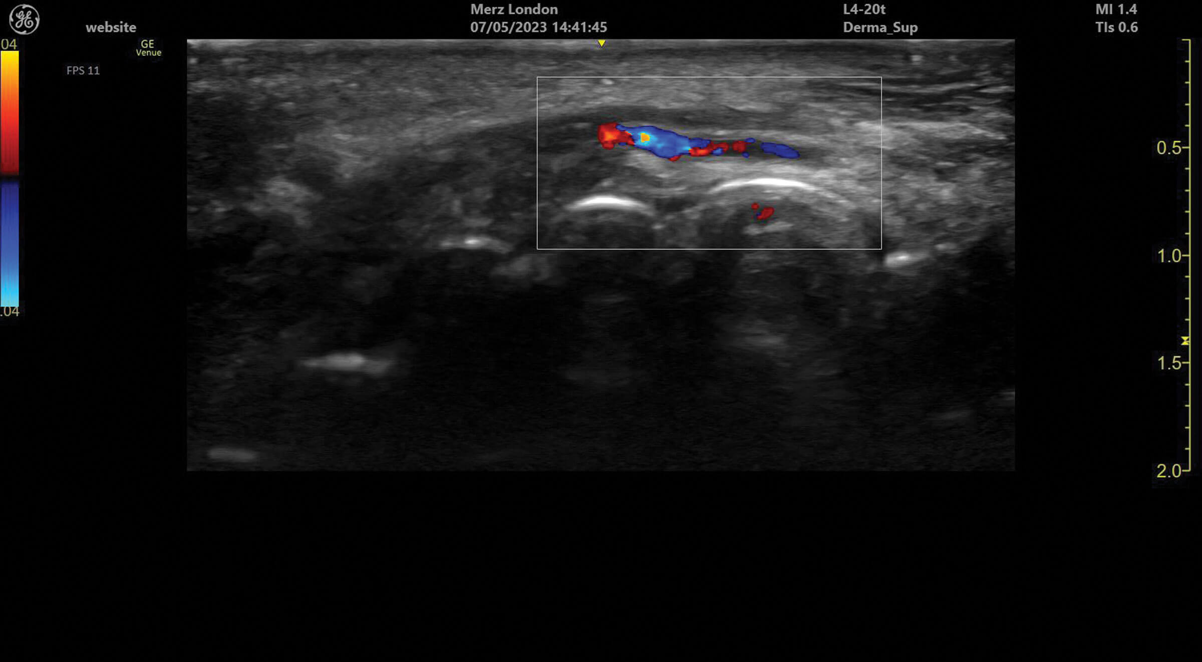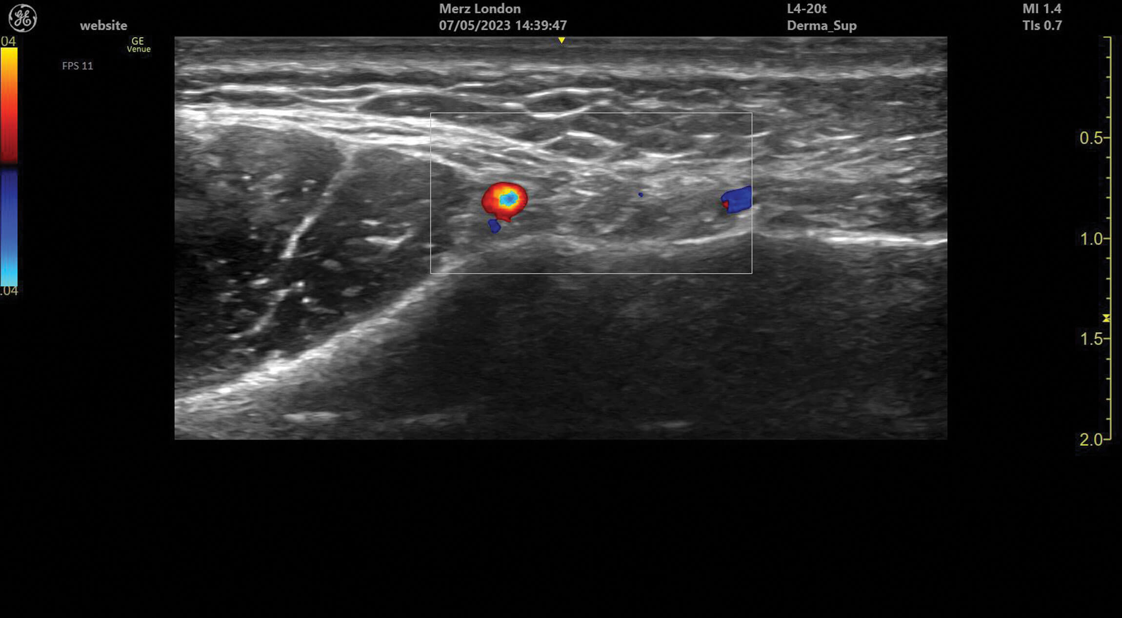 Ultrasound doppler can be used to assess blood vessel flow prior to treatments but can also help identify abnormalities in blood supply after filler treatment. Vessels can be identified and tracked in the tissue allowing for the observation of any anatomical variation. Blood vessels always appear as anechoic structures on ultrasound but, when using a colour doppler, flow can be detected either towards (red) or away (blue) from the ultrasound probe [1].