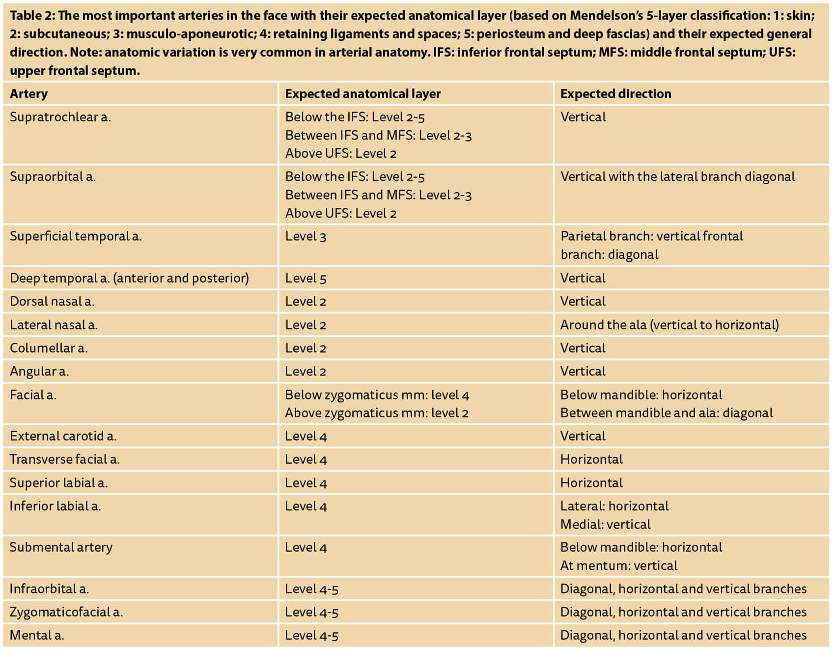 A thorough understanding of peripheral arterial anatomy is essential to reduce the risk of both retinal and peripheral ischaemia. General statements can be made concerning the expected anatomical layer and the general direction of the arteries. Detailed anatomy of the facial vasculature is described elsewhere [9].