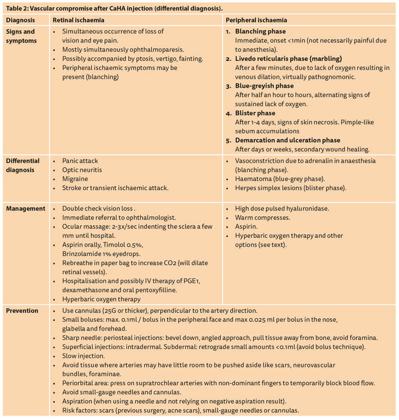 Due to the potential severity of vascular complications, the authors strongly recommend that all injectors should receive special training in the theoretical background and practical skill set of complication management, given that (immediate) referral to an ophthalmologist may be too late when the timeframe to restore reperfusion to the ischaemic retina is 20-60 minutes. When a patient complains of immediate visual loss, blurring and potential central nervous system symptoms such as vertigo, unconsciousness and nausea, retinal ischaemia should be suspected and immediate action is required. Treatment recommendations still have a low level of evidence as they are primarily based on expert opinions. A single drop of topical timolol 0.5% can be applied to the affected eye to reduce the intraocular pressure [6,14]. Carruthers et al. have suggested retrobulbar injections of hyaluronidase [15,16].